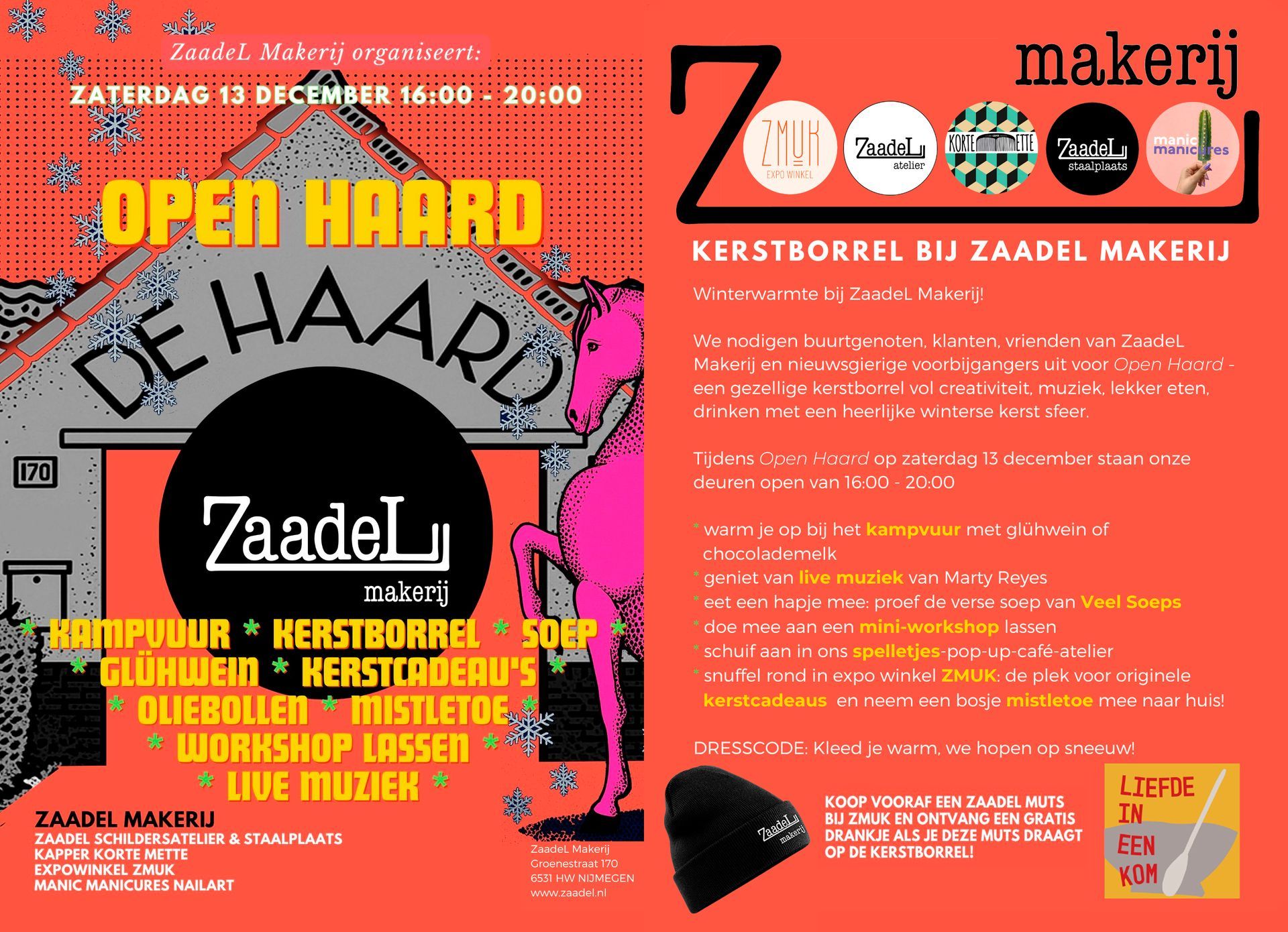 We nodigen buurtgenoten, klanten, vrienden van ZaadeL Makerij en nieuwsgierige voorbijgangers uit voor Open Haard - een gezellige kerstborrel met soep en oliebollen, vol creativiteit en livemuziek bij het kampvuur.